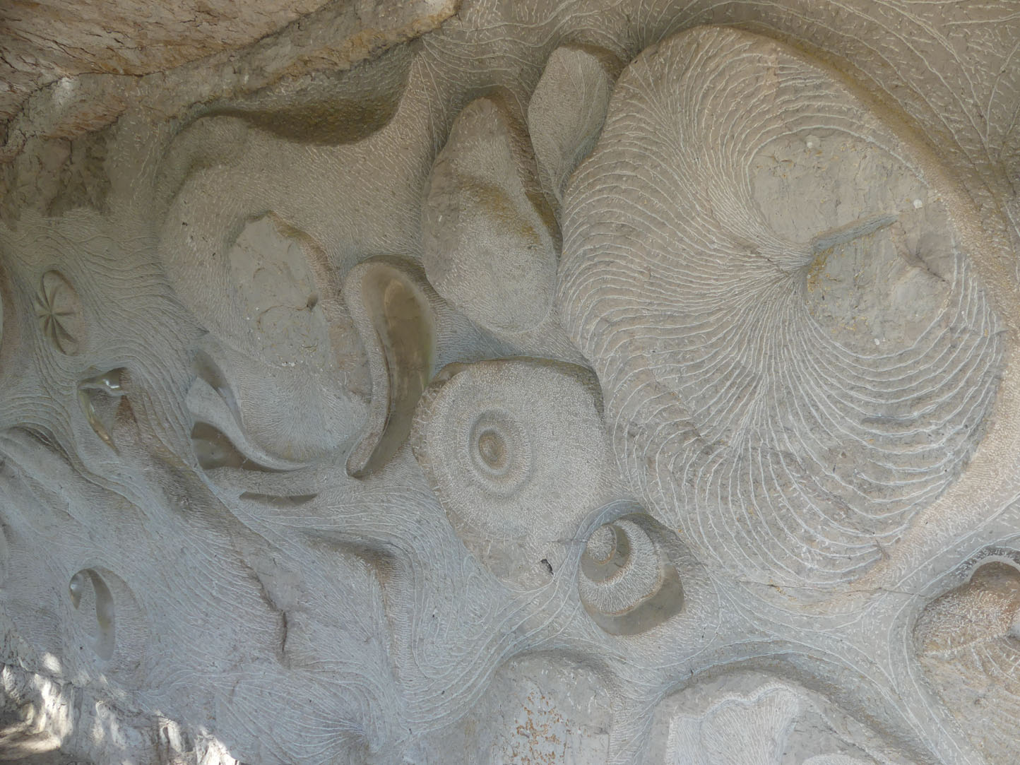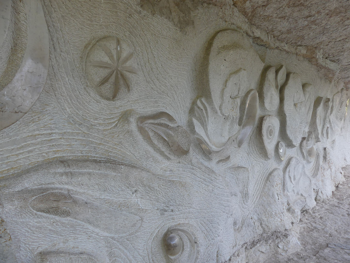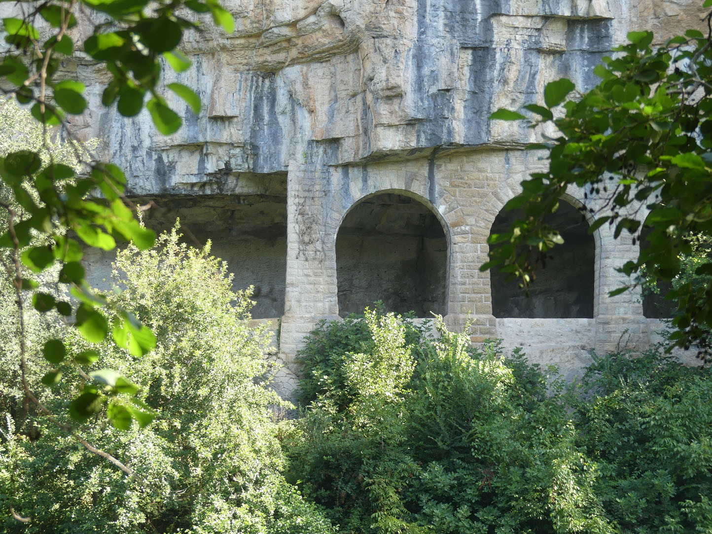 À hauteur d’une écluse, la falaise tombe à pic dans la rivière. Les hommes l’ont donc creusé en 1845 pour permettre de transporter des marchandises sur la rivière. Un artiste toulousain, Monnier, a sculpté sur 30m un bas relief représentant la faune et la flore du Lot.