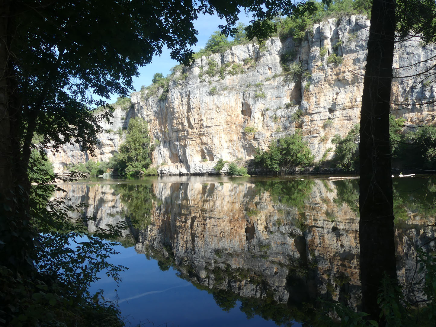 Nous nous sentons vraiment petit au cœur des impressionnantes falaises de calcaire (80m) dans lesquelles le Lot a creusé son lit. Le reflet de ces gigantesques pierres dans la rivière accentue cette sensation de gigantisme. Ce paysage fait penser à une peinture avec cette palette de couleur. Le bleu intense de la rivière, le vert de la végétation et la teinte blanche du calcaire sublimée par le soleil.