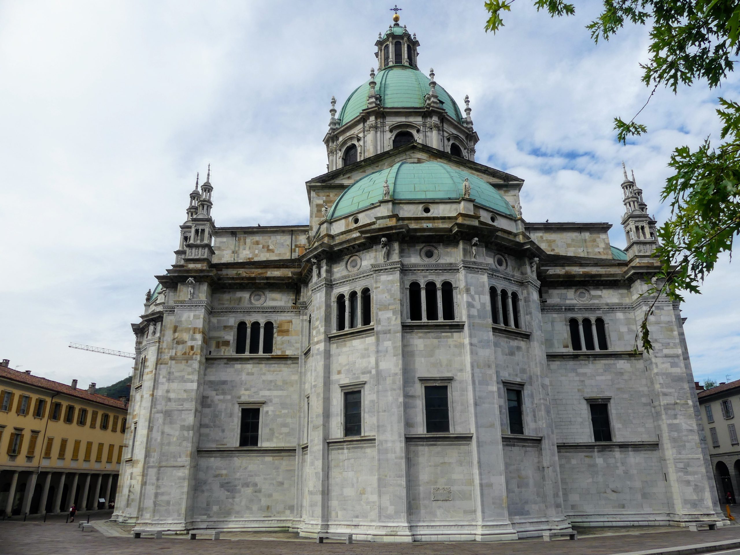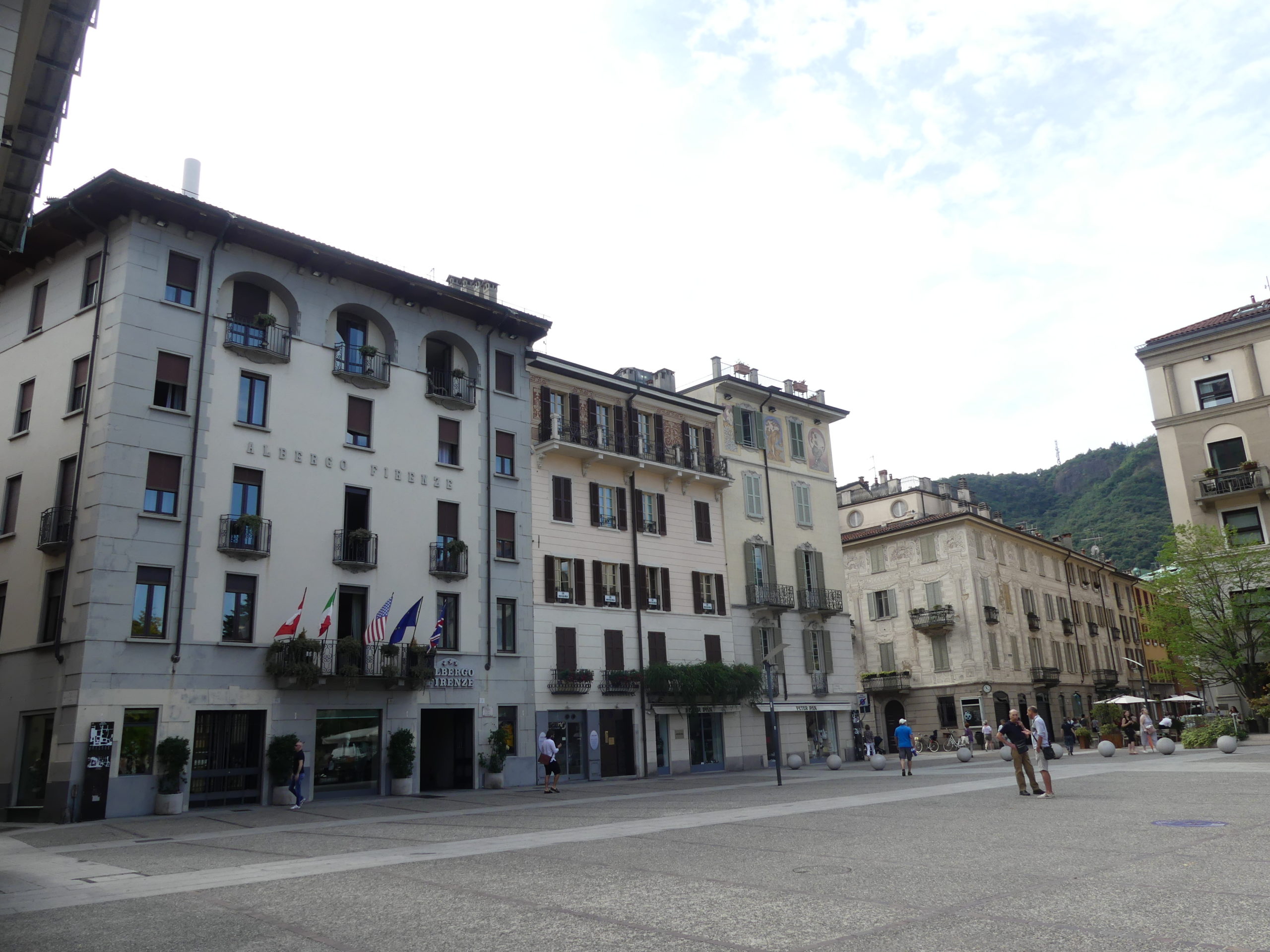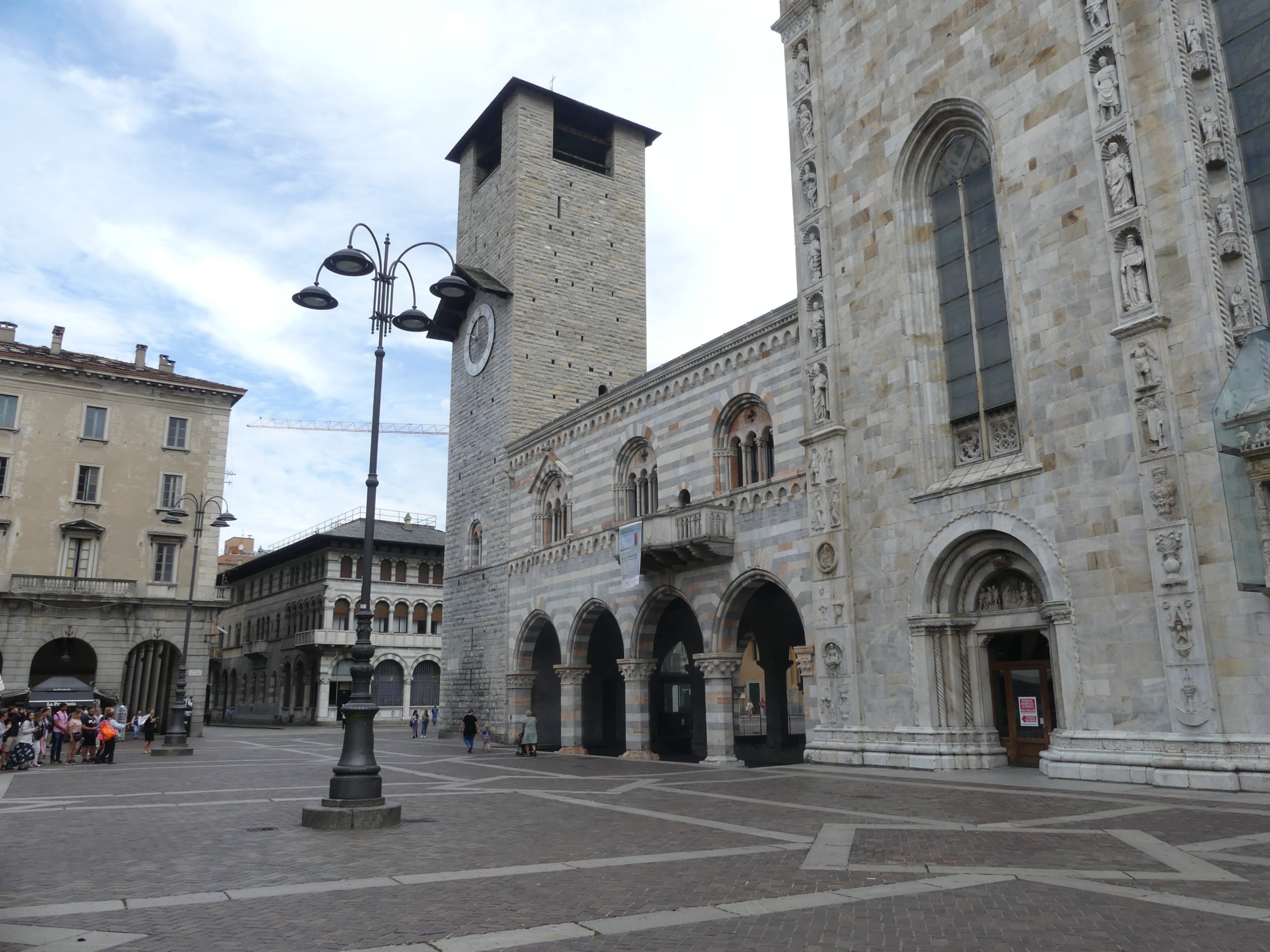Située à l’extrémité sud du lac (du même nom), Côme est une ville plus développée et industrialisée que les autres villages pittoresques des rives du lac. Nous visitons la ville le matin. Bonne idée car la circulation est dense mais le centre ville piétonnier encore calme. Nous entrons dans le centre historique par une immense porte. Le style architectural nous plait beaucoup avec de nombreuses rues et maisons attrayantes, plusieurs « piazzas » et l’impressionnante cathédrale avec son dôme. Nous distinguons des ajouts successifs au bâtiment de sorte qu’il incorpore à la fois des styles gothique et renaissance.