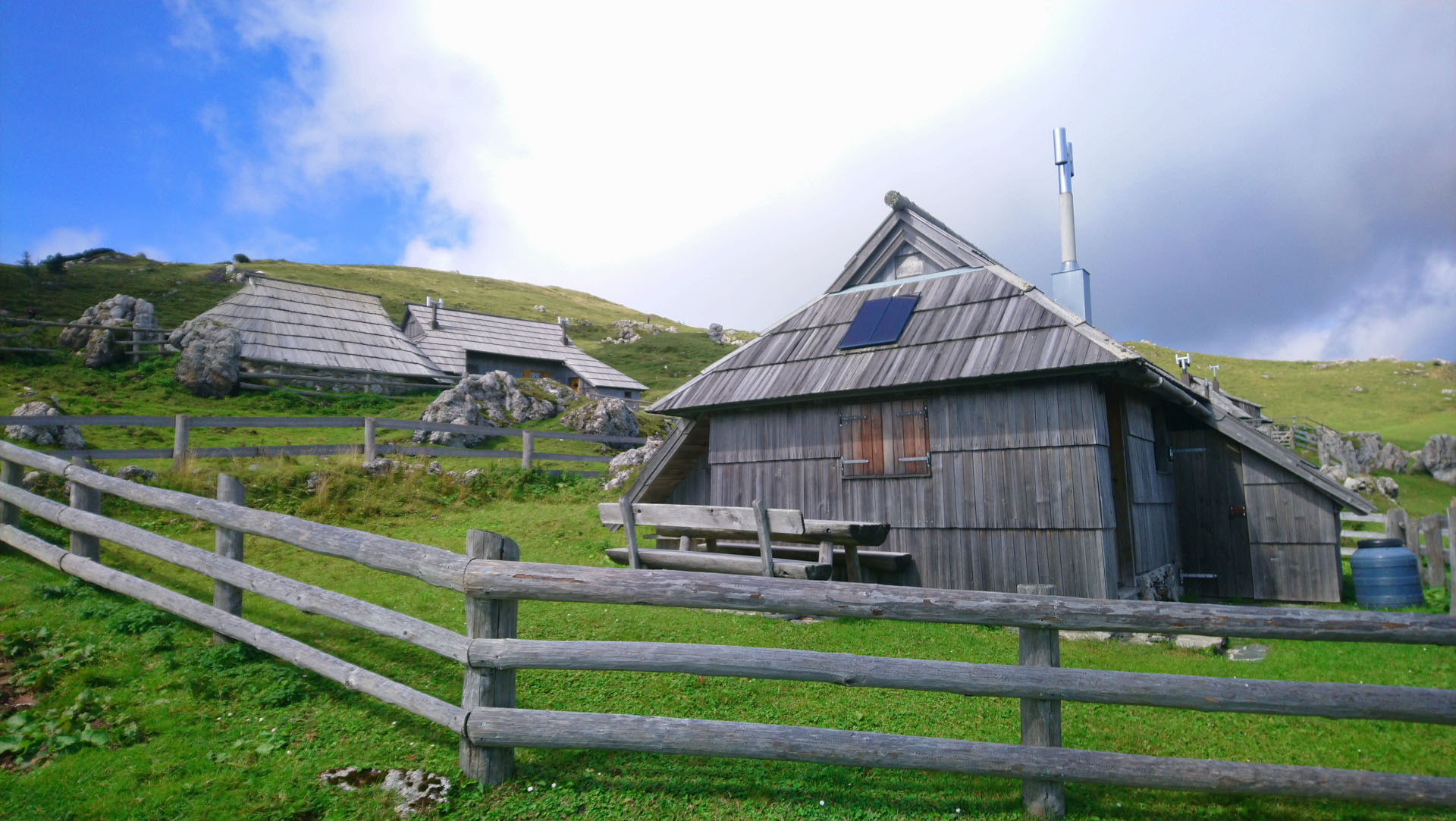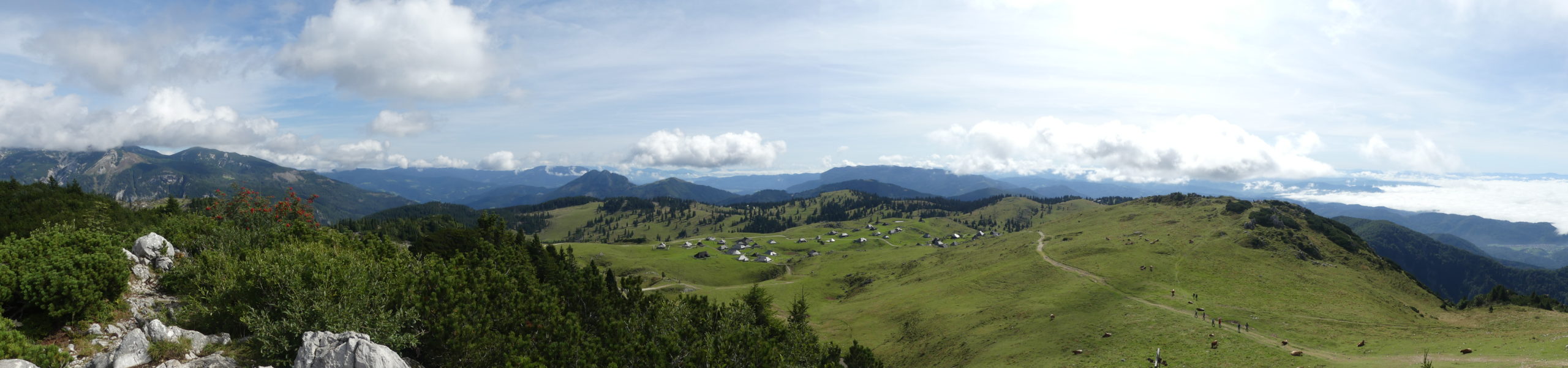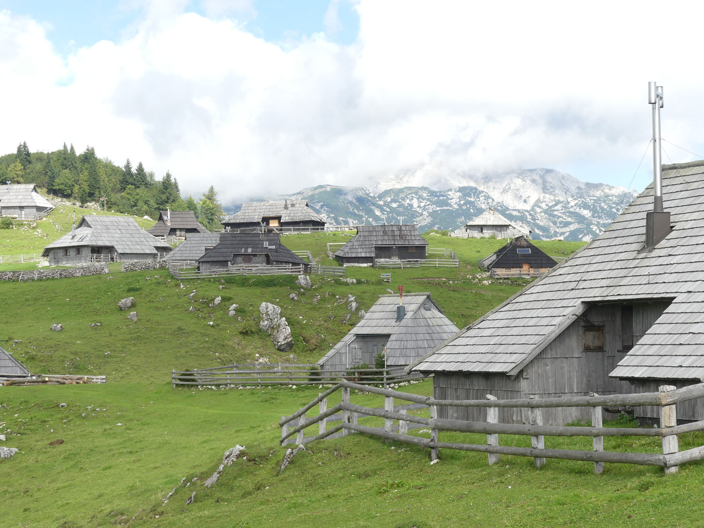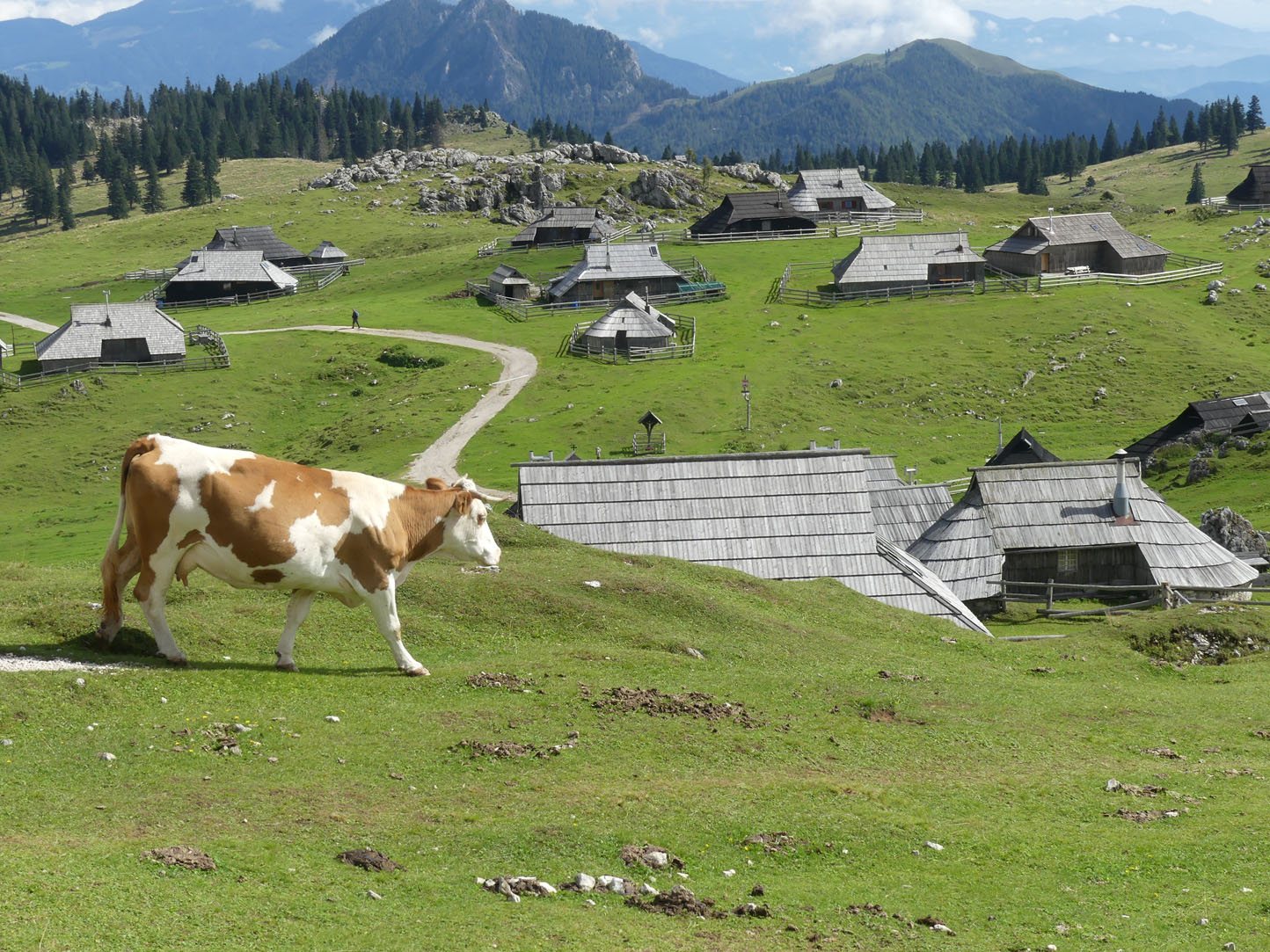 Légèrement vallonné, les prairies verdoyantes se prêtent à une superbe balade rythmée par le tintement des cloches des vaches. Ces Alpes sont encore différentes de celles que nous connaissons en France et en Italie mais elles n’ont rien à envier à leurs voisines. L’ambiance est paisible, nous nous promenons sur l’herbe rase entourée de fleurs de montagnes entre des petites huttes en bois. Nous profitons d’un vrai casse-croûte de berger chez un local accueillant et sympa : zganci (spécialité à base de farine de blé noir et de viande hachée) et trnic (spécialité fromagère locale)… un délice. J’ai le droit de visiter la hutte, l’intérieur est très cosy et chaleureux. Un beau nid douillet pour les rudes soirées d’hiver.