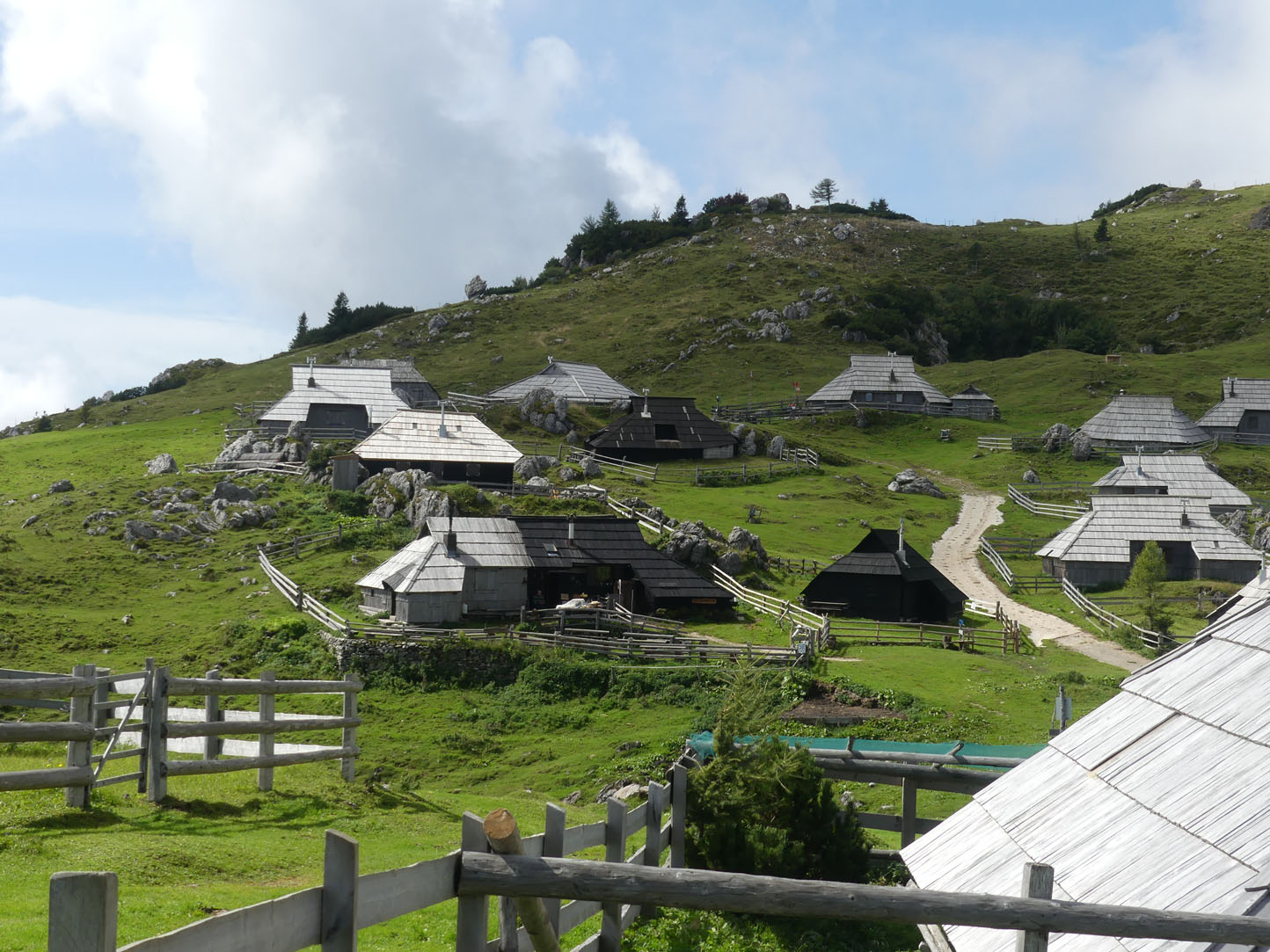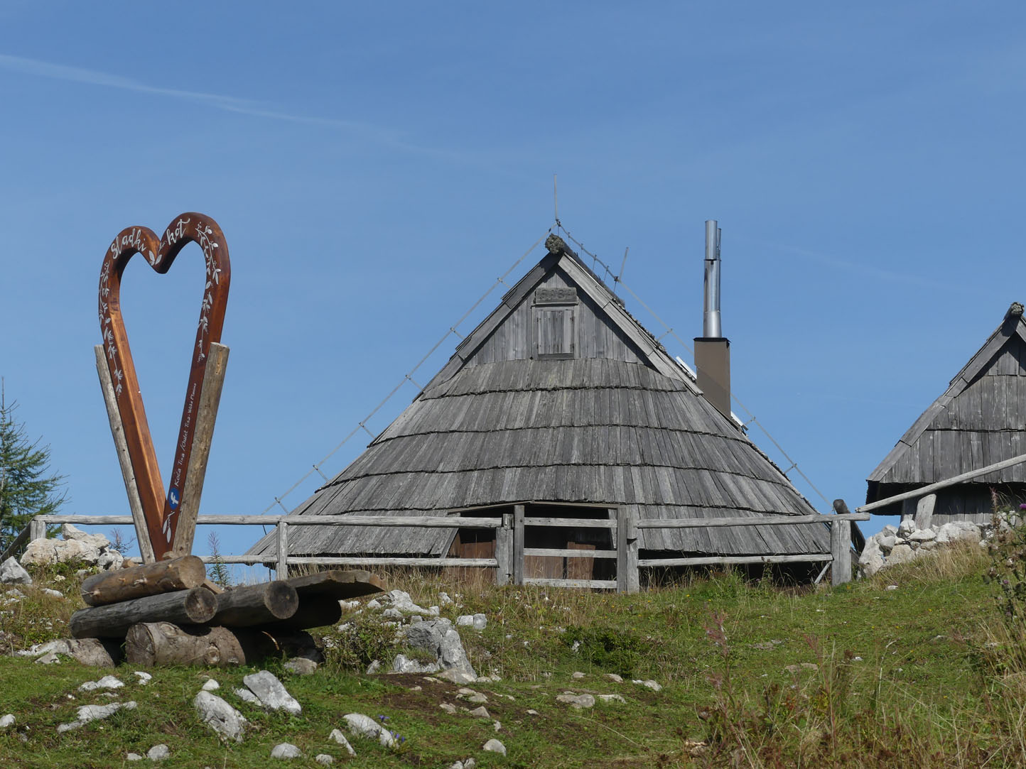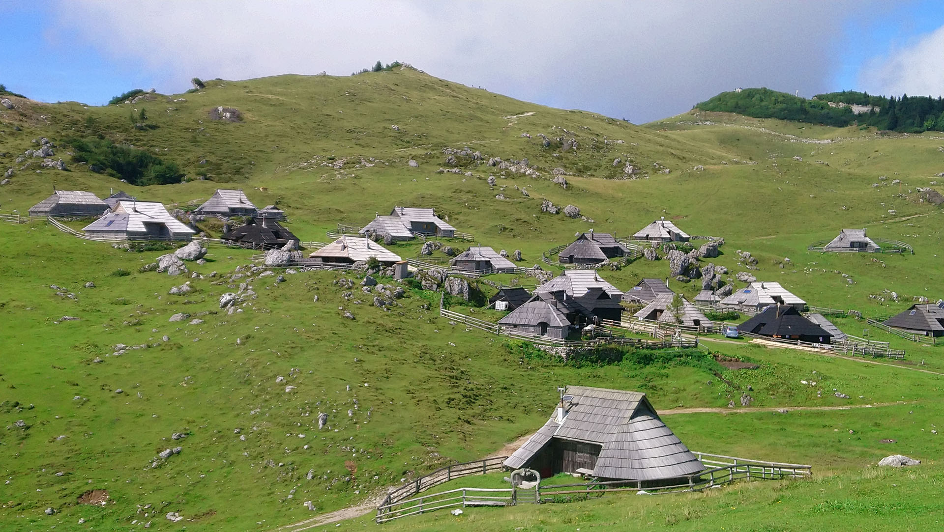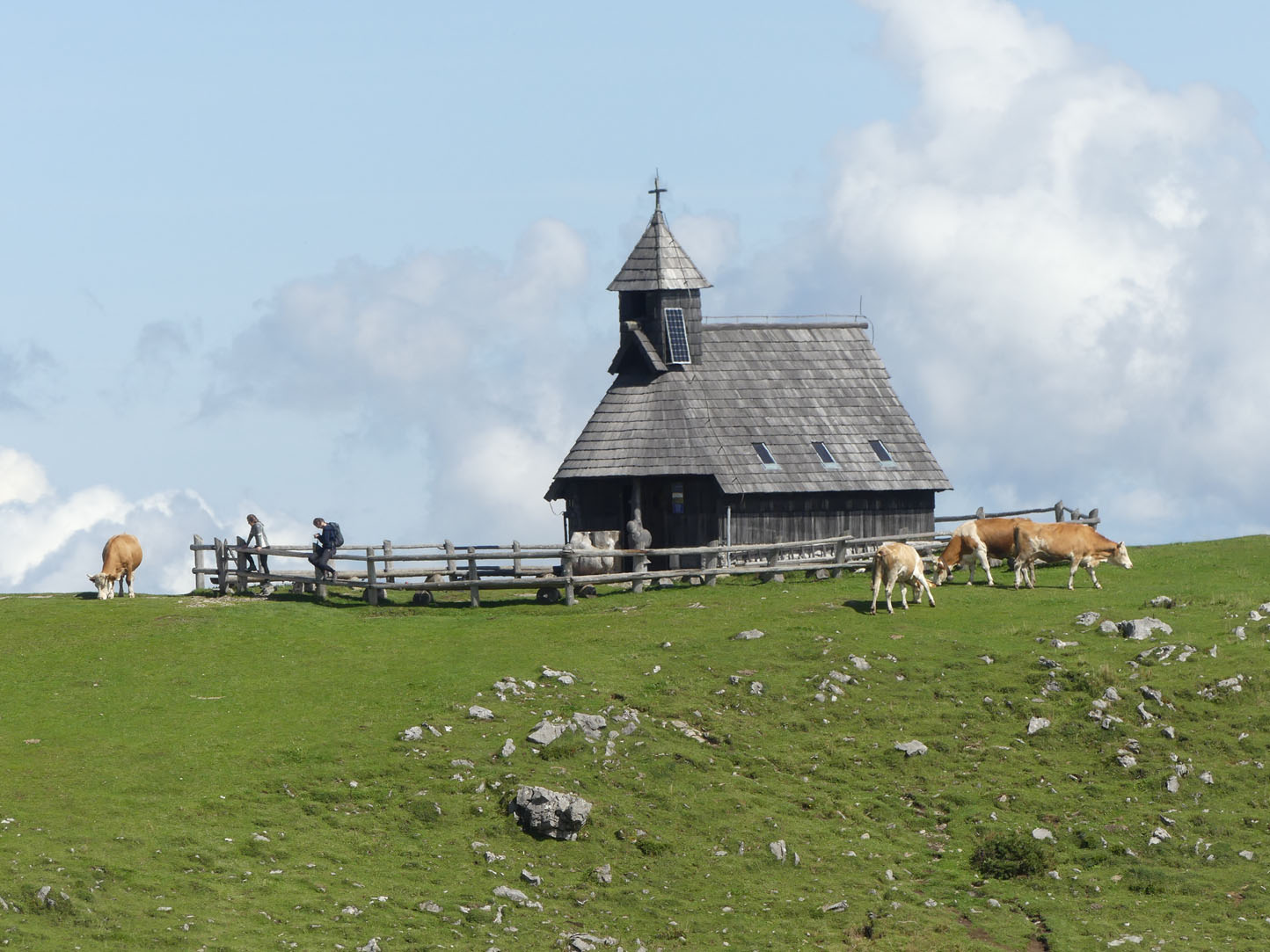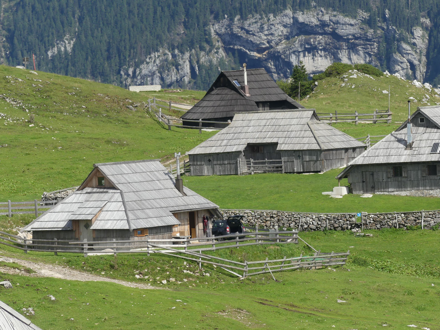 Légèrement vallonné, les prairies verdoyantes se prêtent à une superbe balade rythmée par le tintement des cloches des vaches. Ces Alpes sont encore différentes de celles que nous connaissons en France et en Italie mais elles n’ont rien à envier à leurs voisines. L’ambiance est paisible, nous nous promenons sur l’herbe rase entourée de fleurs de montagnes entre des petites huttes en bois. Nous profitons d’un vrai casse-croûte de berger chez un local accueillant et sympa : zganci (spécialité à base de farine de blé noir et de viande hachée) et trnic (spécialité fromagère locale)… un délice. J’ai le droit de visiter la hutte, l’intérieur est très cosy et chaleureux. Un beau nid douillet pour les rudes soirées d’hiver.