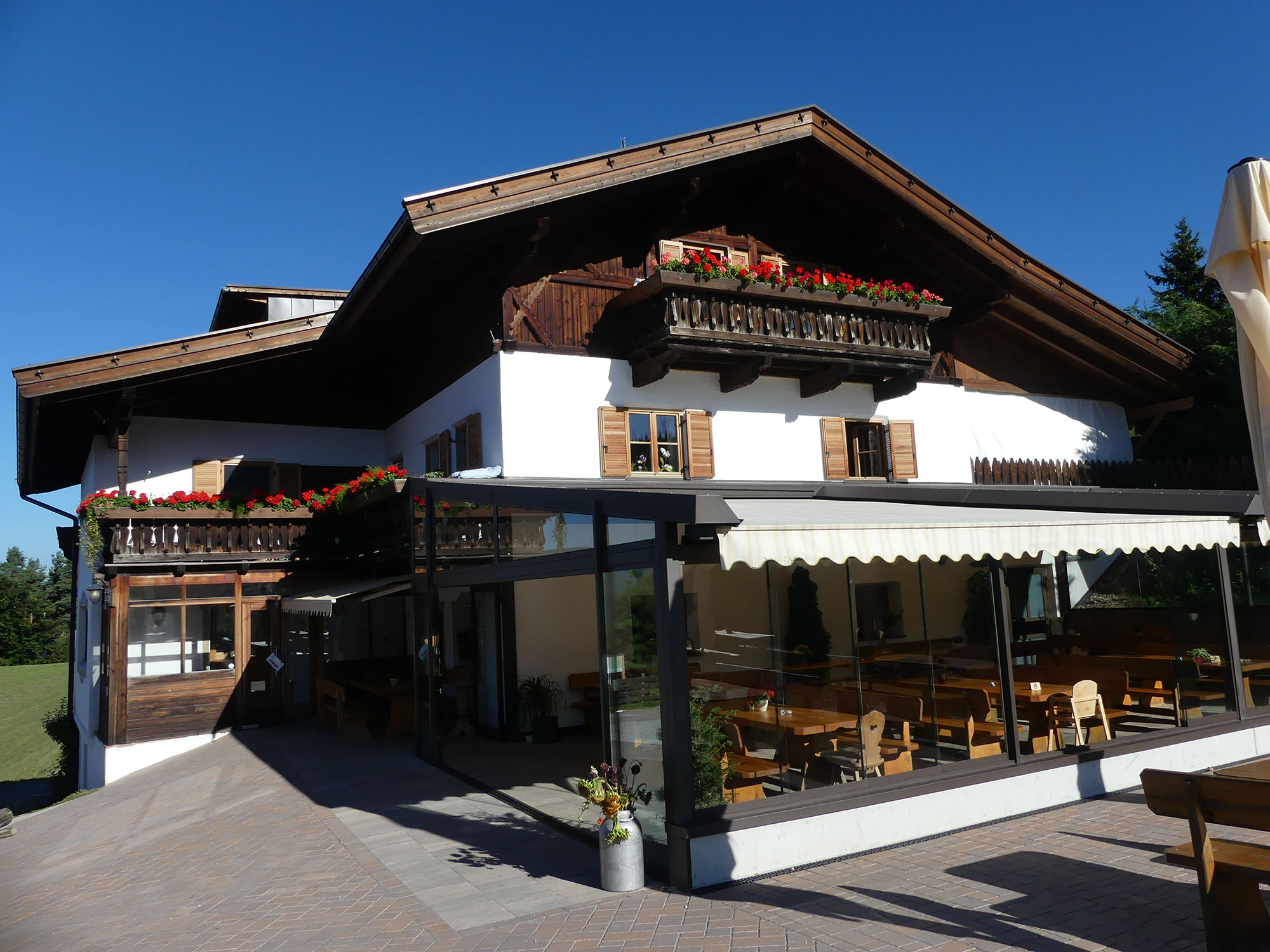 Cette nuit nous dormons dans une ferme « Unterreggerhof » (GPS 46.454673 11.462386) avec vue sur les Dolomites. Toujours dans les Alpes, le changement de décor est total. Ces montagnes sont aussi somptueuses qu’atypiques. Nous dînons dans le « Gasthaus » un bon repas typiquement local (gulasch et escalope milanaise) en admirant ces rochers gris aiguisés tel des dents de requin. Les hôtes sont très sympas et accueillants. Ils nous offrent un petit schnaps fait maison.