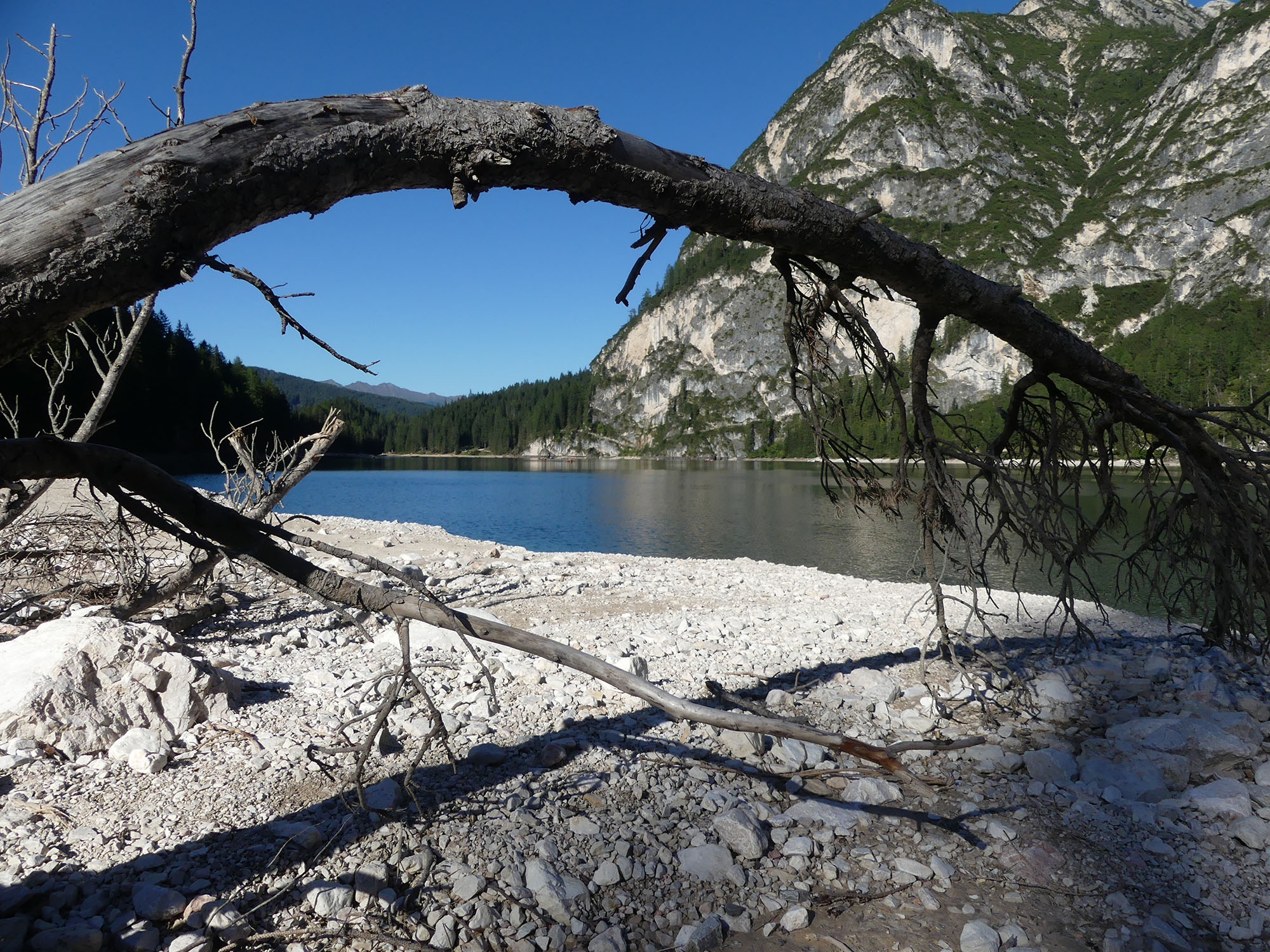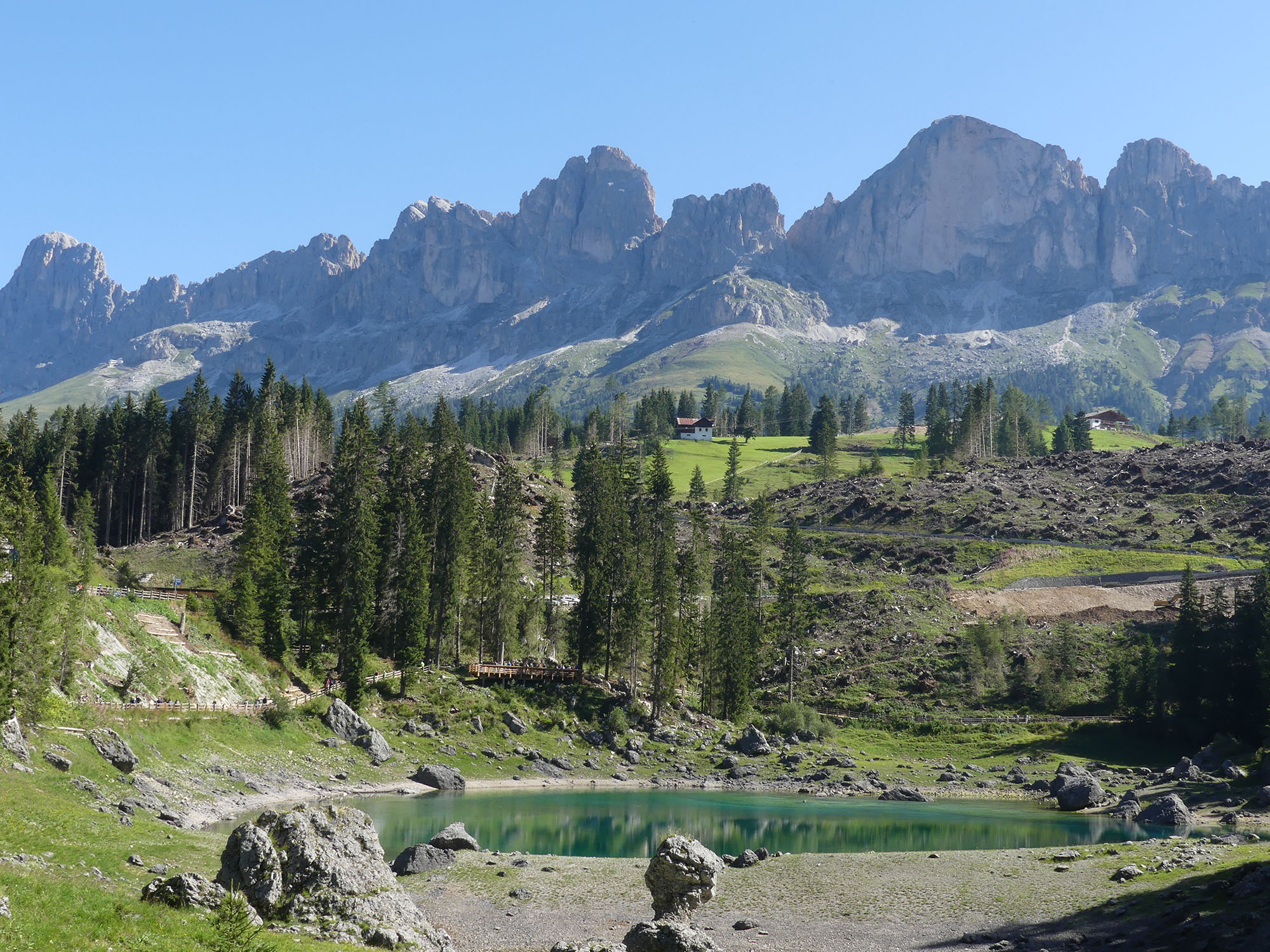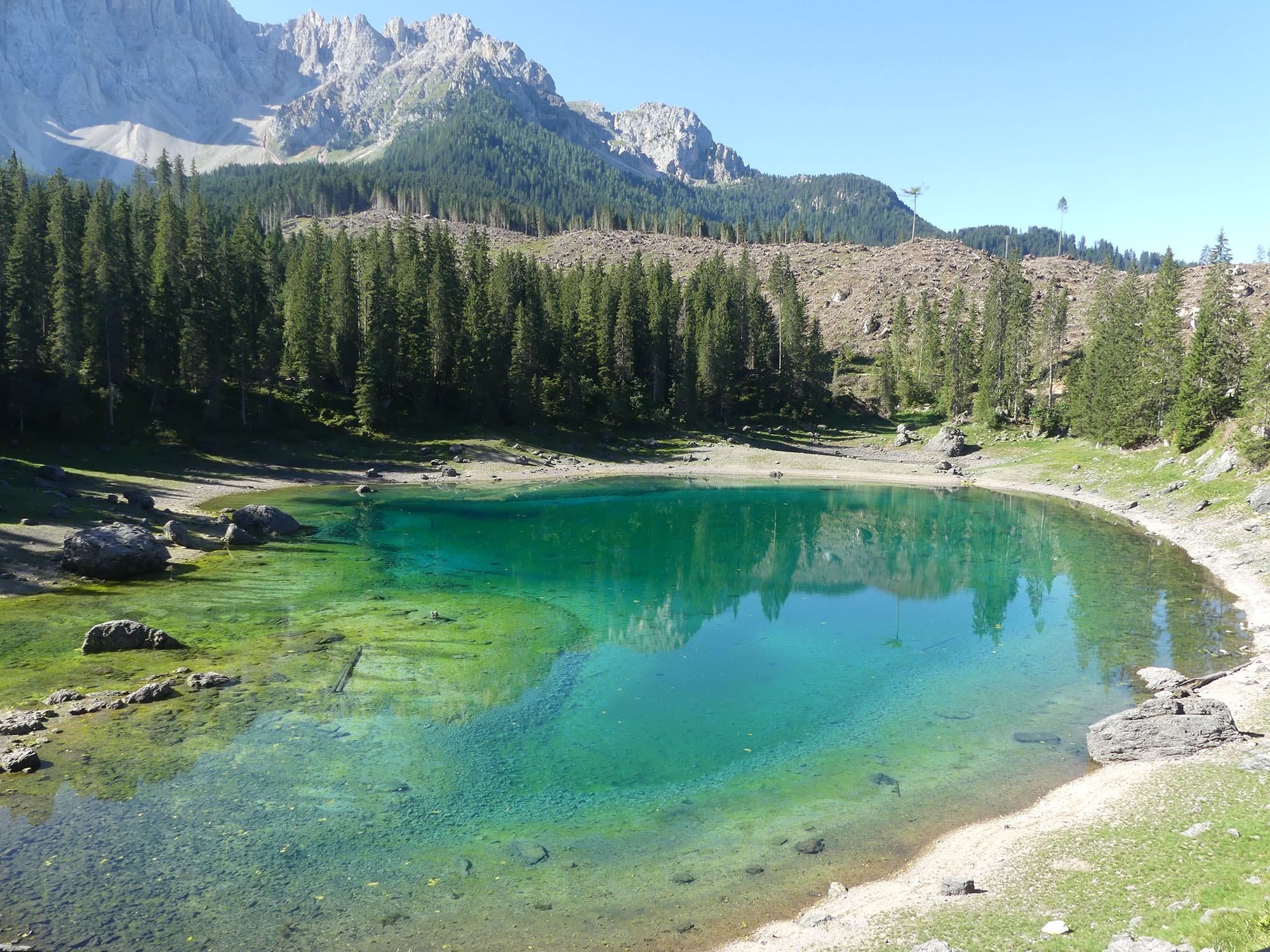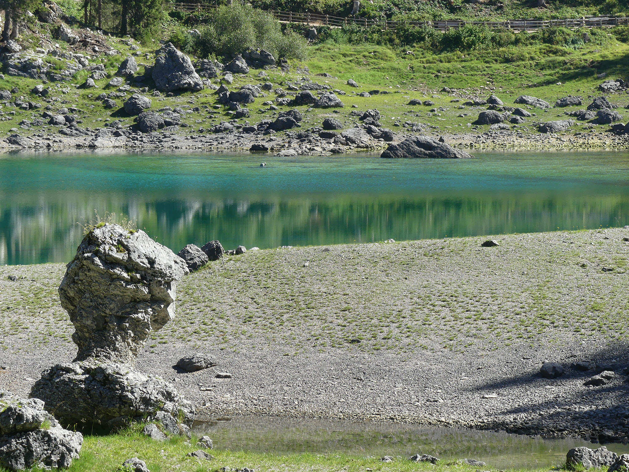 Nous partons à la conquête des lacs des Dolomites. Un premier petit lac, peu connu « lac de Carrezza ». Petit par la taille mais grand par sa beauté. Un saphir dans son écrin de verdure et de roche. Surnommé le lac de l’arc-en-ciel, ses couleurs passent du vert au bleu turquoise dans un dégradé somptueux. Un chemin aménagé et facile d’accès permet de faire le tour du lac en longeant une forêt de sapins.