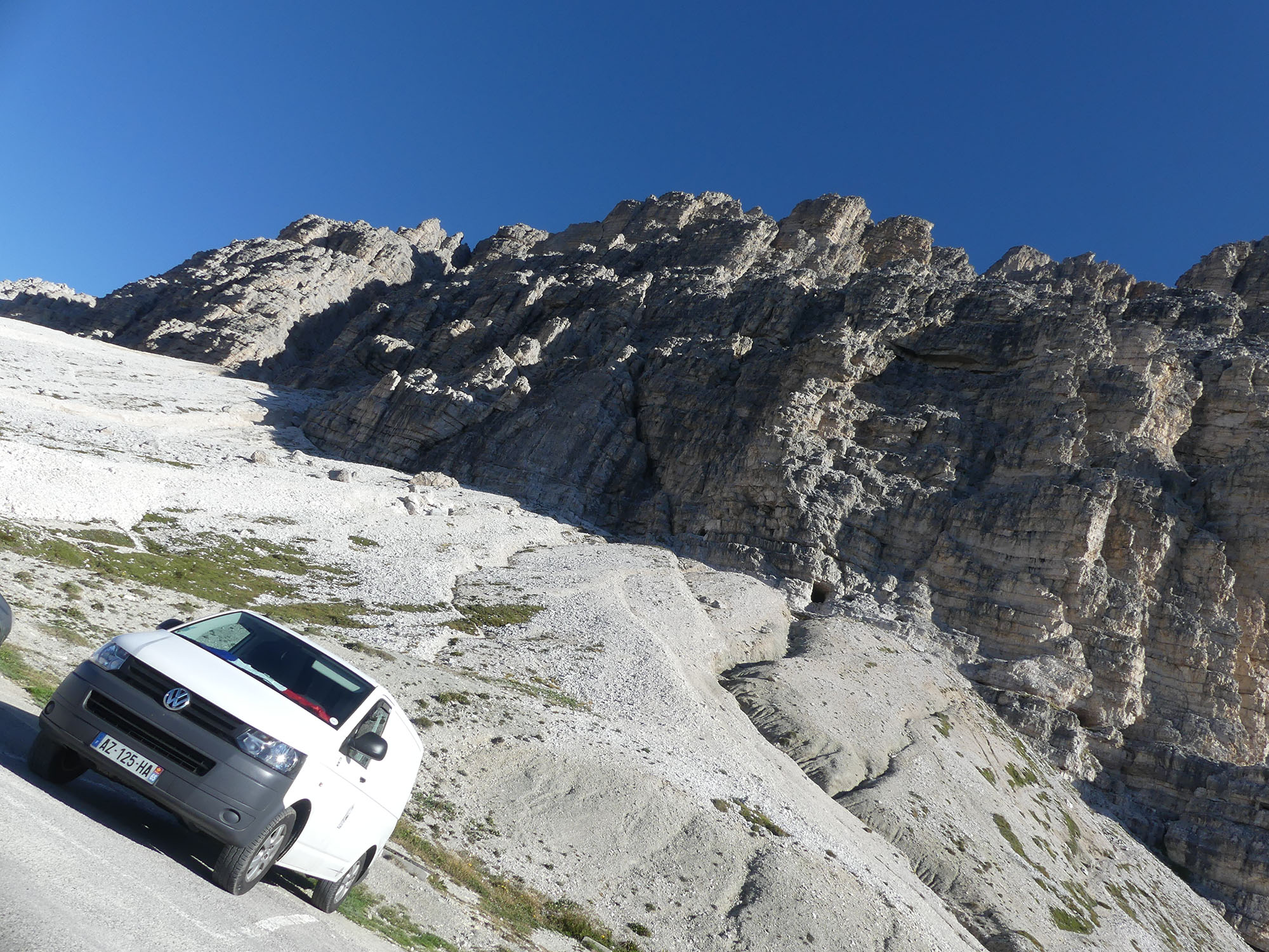 Au bout de 5h de marche, nous revenons au van fatigués mais heureux et apaisés. Nous reprenons la route vers notre prochaine étape. Petite halte pour voir le lac de Sorapis apparemment pas très loin. Nous marchons, marchons, marchons mais pas de lac à l’horizon. Devant l’immense montagne qui se dresse devant nous, j’abdique. Nous croisons des allemands qui redescendent du lac. Il resterait encore 1h de marche avec des passages à escalader. Nous redescendons…dommage.