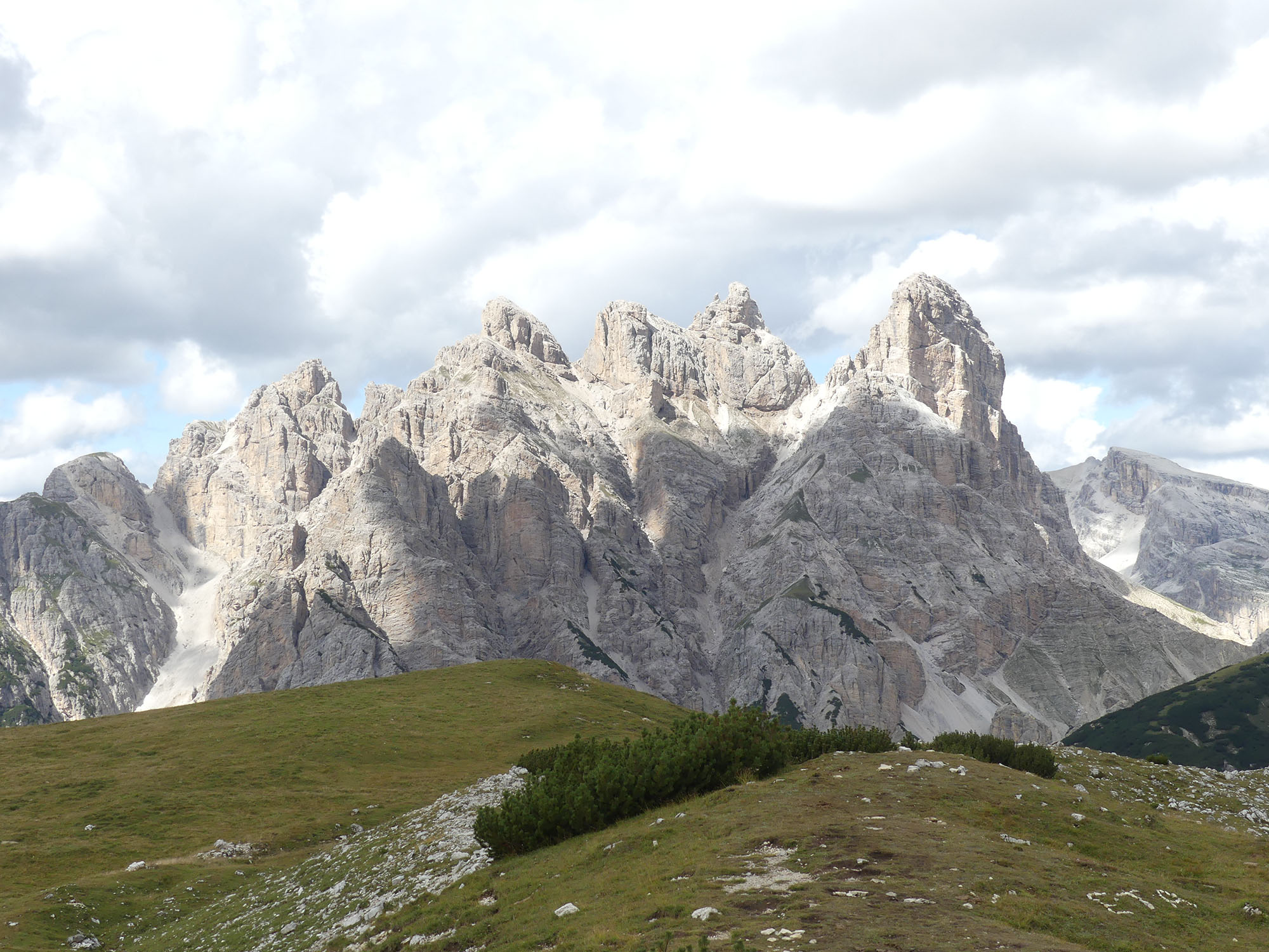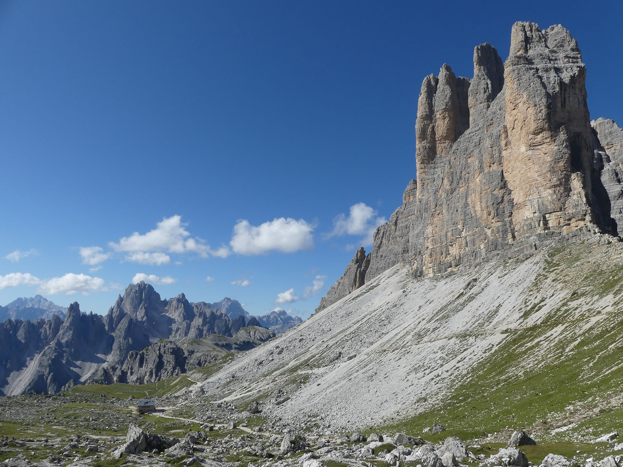 Les Tre Cime sont le symbole des Dolomites : 3 menhirs entourés d’une couronne d’autres groupes montagneux. La Cima Grande est le sommet le plus haut (2 999m), qui se distingue par sa face Nord de 500m de haut, sillonnée de grandes stries noires.