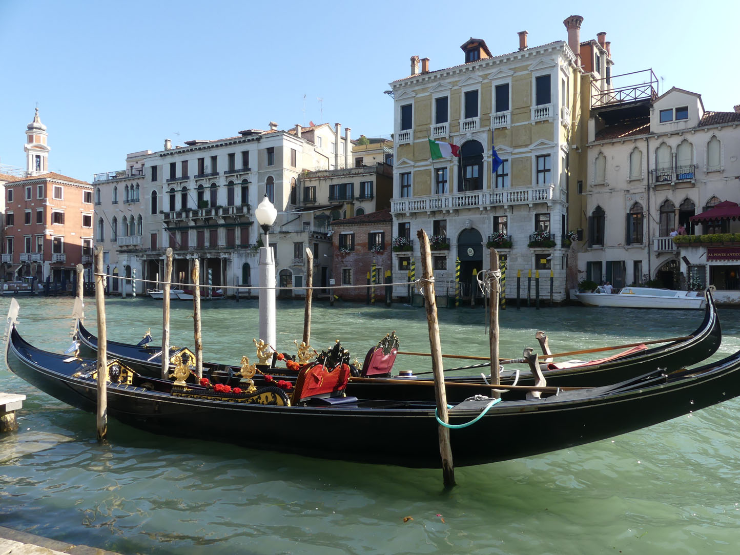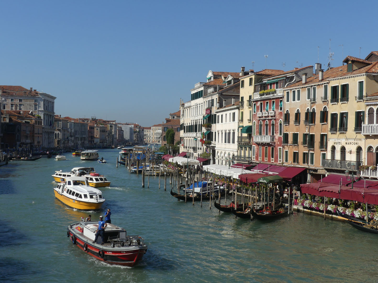 Sortis de la gare, nous arrivons sur le grand canal. Le dépaysement est total. Entièrement construite sur l’eau, Venise comprend 177 canaux et 455 ponts. Insolite de se dire que les taxis et les bus sont des bateaux.