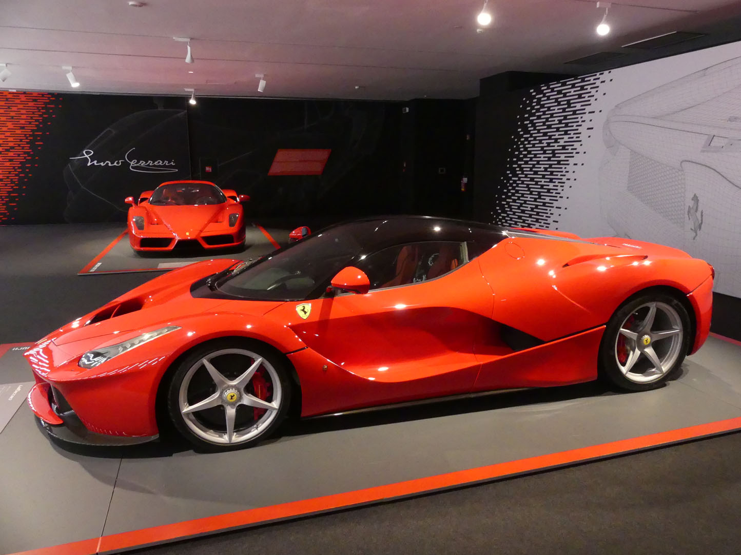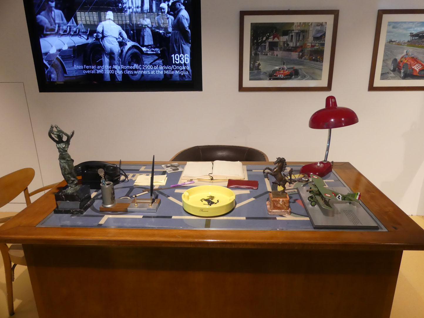Un espace est réservé à la 1ère voiture d’Enzo Ferrari, son bureau est même reconstitué. Il est intéressant de découvrir l’évolution de la technologie. Il y a encore 50 ans, les pilotes faisaient beaucoup de manipulation manuellement, une performance plus que physique. À noter que la transition énergétique n’est pas à l’ordre du jour chez Ferrari. Le prochain modèle est une vraie « batmobile ». Sont également exposés des moteurs, des freins, des anciens plans d’archives.