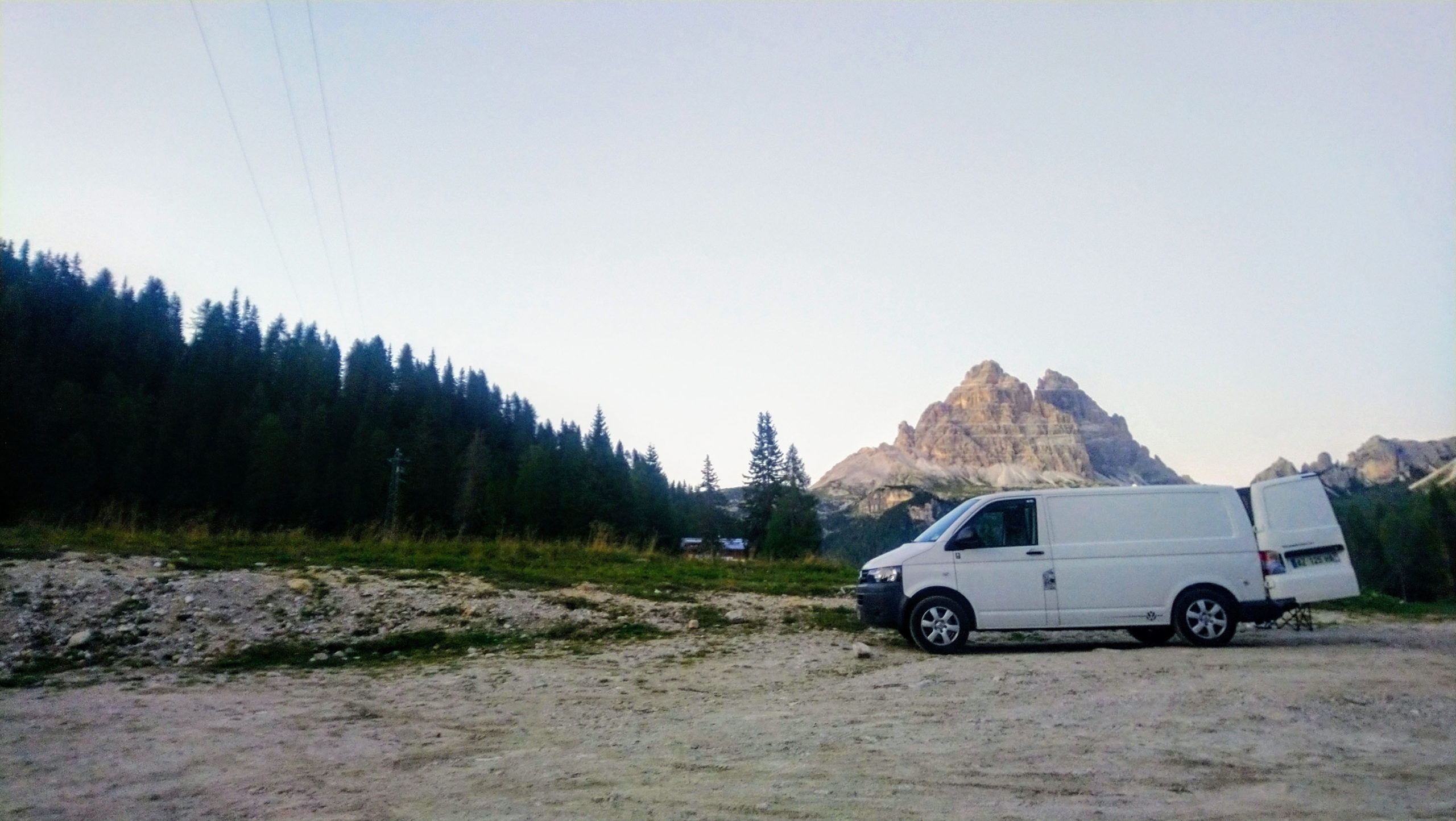 Pour notre spot du soir, nous stationnons en bas de la route qui mène aux Trois Cimes avec une vue sur les mythiques sommets des Dolomites. Un avant goût de notre visite du lendemain. Nous partageons le spot avec des allemands, des autrichiens et des isérois… Il y a si peu de touristes français que le contact s’établit naturellement lorsque nous en rencontrons. Nous regagnons assez vite nos pénates car les températures chutent dès la tombée de la nuit.