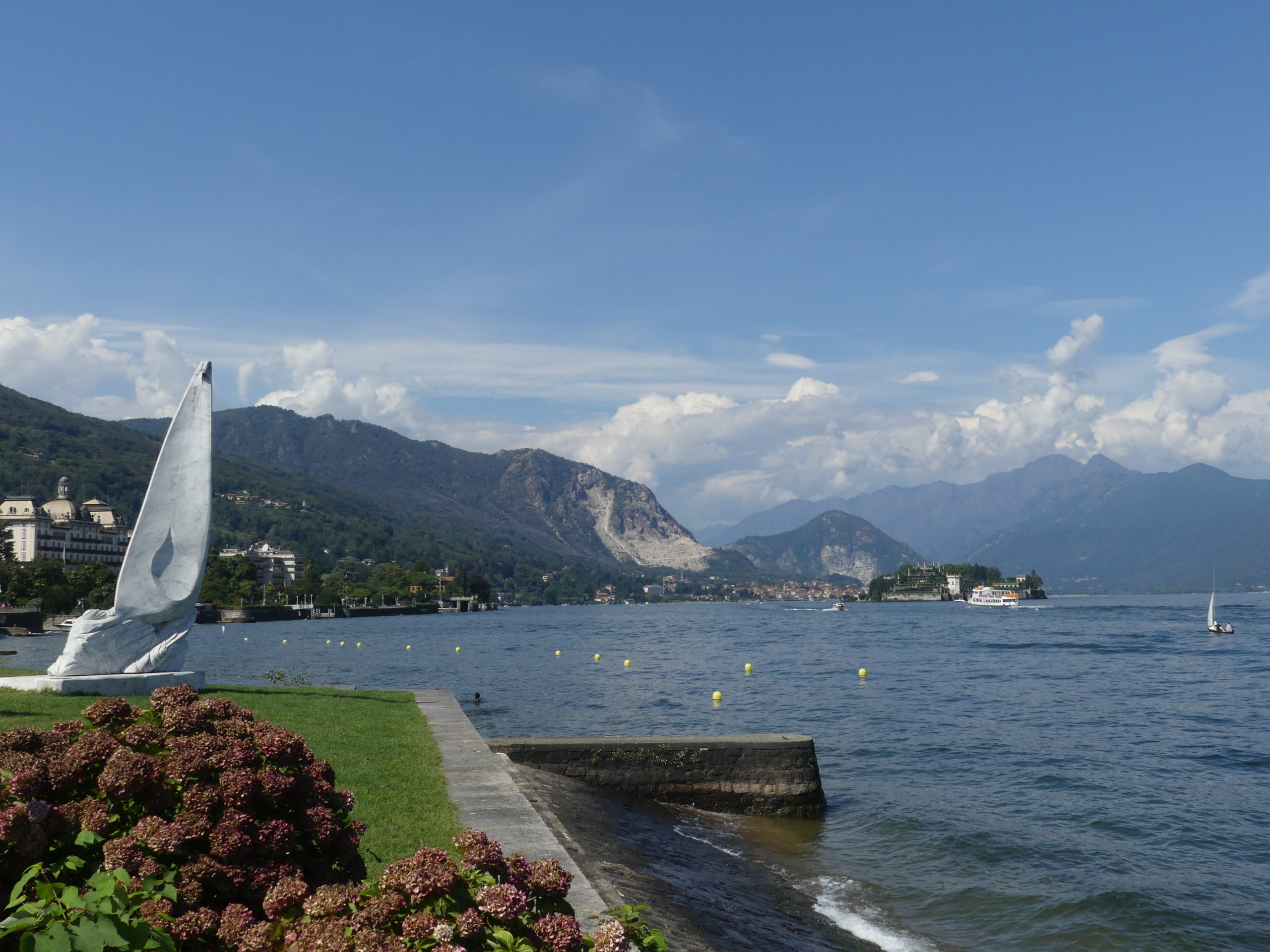 Nous démarrons nos visites des lacs alpins par le célèbre Lac Majeur. Nous arrivons sur les hauteurs de STRESA et déjà nous en prenons plein les yeux sur ce gigantesque lac bleu azur à perte de vue entouré par les montagnes. Nous apercevons au milieu du lac la charmante île d’Isa Bella, qui porte bien son nom.
